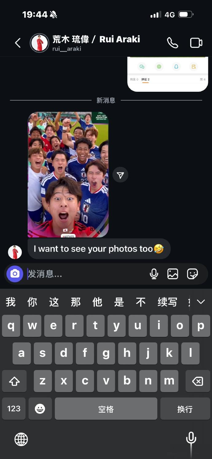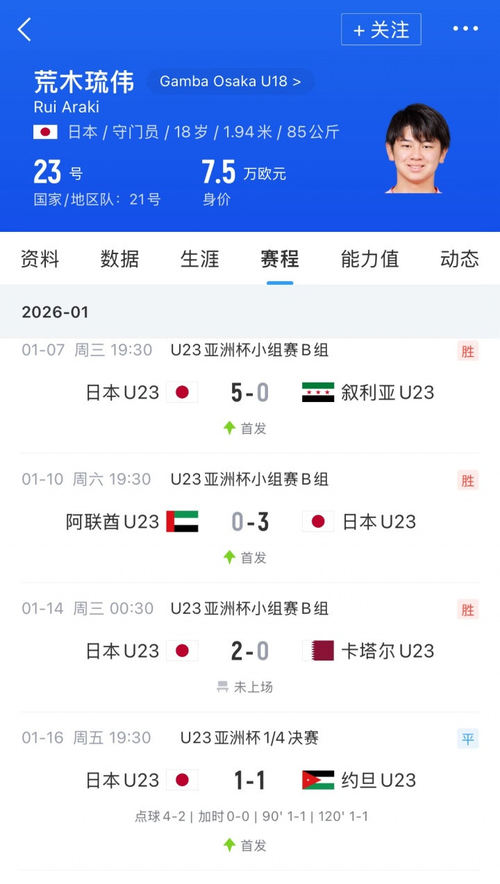 昨日日本队获胜后,我关注了日本国脚荒木琉伟。