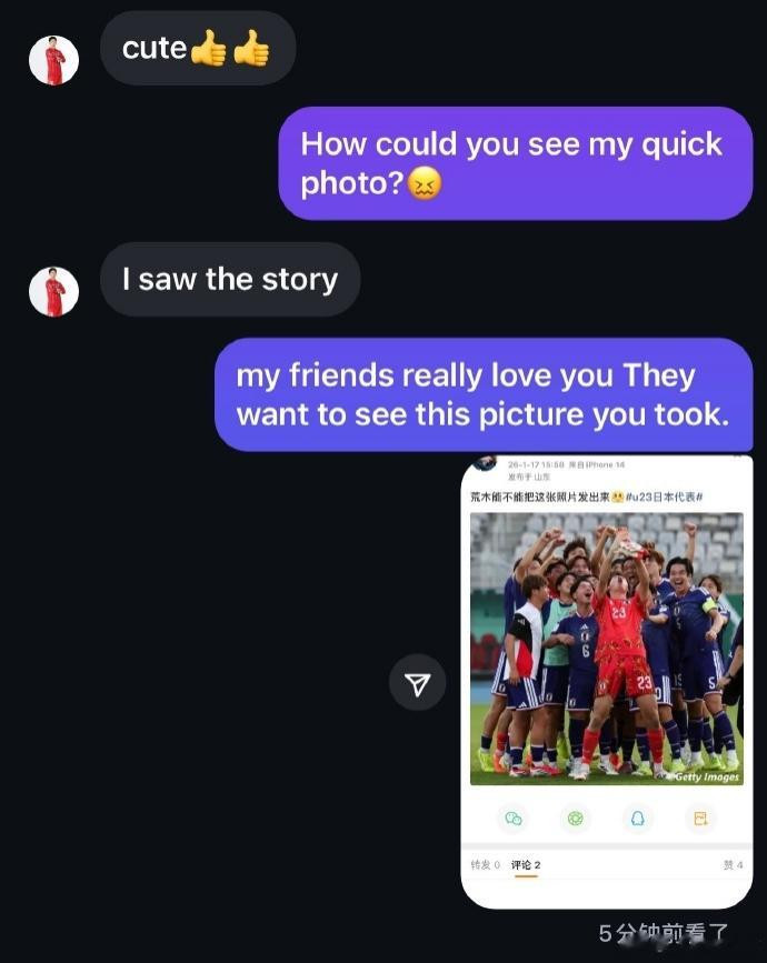 出于好奇他为何能看到,我进行了询问,之后因朋友曾提过想看一张由他拍摄的全队合照,我便向他提出请求。