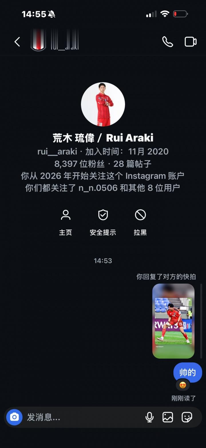 微博账号为“_Onechat”的网友爆料,称自己在INS遭遇日本U23门将荒木琉伟骚扰,并晒出多张聊天截图。荒木琉伟现年18岁,身高1米94,效力于大阪钢巴青年队,跳级入选日本U20,曾随队参加U20亚洲杯。今年荒木琉伟入选日本U23名单,是本届U23亚洲杯日本队的首发门将。