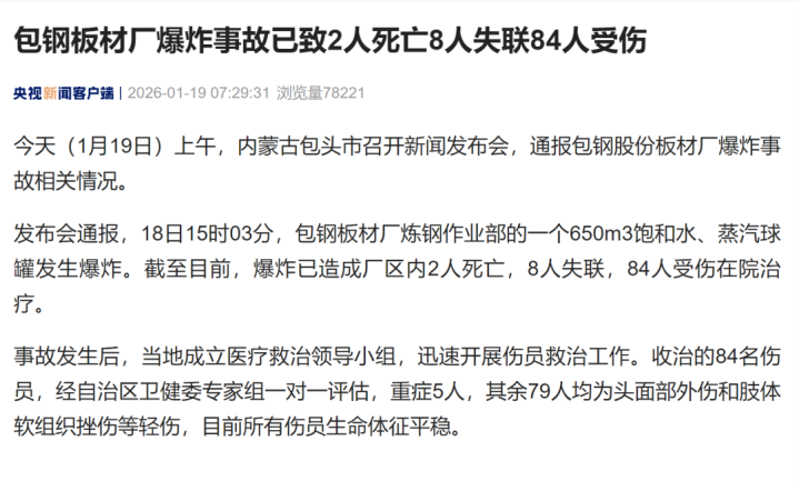 值得注意的是,就在事故发生前两天,包钢集团官方微信公众号发布消息称,包钢(集团)公司安委会召开2026年第1次(扩大)会议。会上,公司主要负责人强调,要深刻认识当前安全形势,聚焦突出问题开展集中整治和隐患排查治理。要抓责任、抓落实、抓执行,确保责任落地、措施落地,持续营造平稳向好的安全局面。