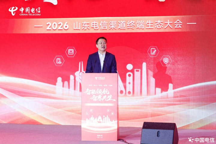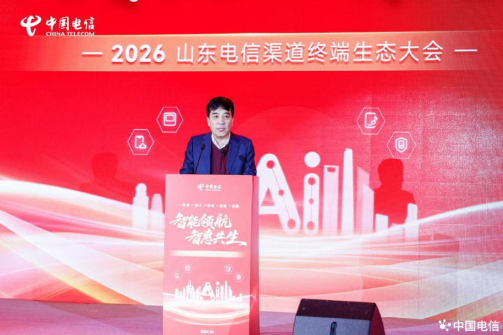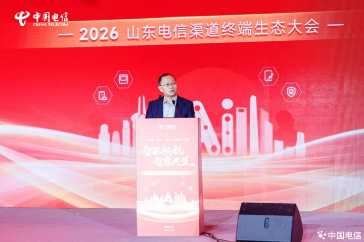 近日,以“智能领航,智惠共生”为主题的2026中国电信山东公司(以下简称“山东电信”)渠道终端生态大会在济南成功举办。本次大会上,山东电信与集团各专业公司、线上线下渠道合作伙伴及终端厂家代表等300余位嘉宾齐聚一堂,立足数字化转型浪潮,聚焦渠道赋能和生态共建,齐心擘画新一年山东通信行业渠道终端生态高质量发展的新蓝图。中国电信集团公司全渠道运营中心党委副书记、副总经理徐岩和天翼电信终端公司副总经理桂烜到会做了专题致辞,对大会的成功举办表示了祝贺,并对山东电信渠道终端生态运营给予充分肯定,提出殷切的期望。