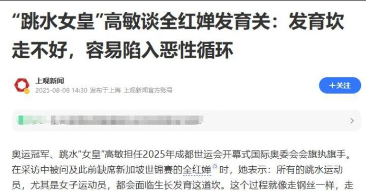 高敏莫得毁灭教唆,2025年8月,全红婵被体重困扰,收获波动,骂声四起,以至有退役传言。