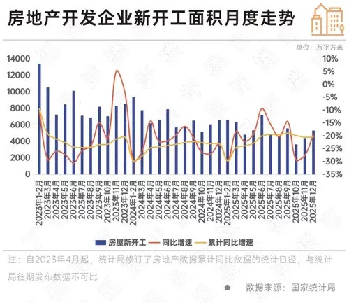 国家统计局数据显示,2025年,房地产开发企业房屋施工面积659890万平方米,比上年下降10.0%。其中,住宅施工面积460123万平方米,下降10.3%。房屋新开工面积58770万平方米,下降20.4%。其中,住宅新开工面积42984万平方米,下降19.8%。