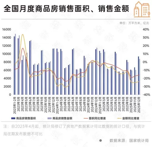 {jz:field.toptypename/}值得注意的是,此次国家统计局公布的商品房成交金额、面积,房地产开发投资、新开工面积、竣工面积等数值,与1月7日“长期主义——丁祖昱评楼市2026年度发布会”预测数值接近。
