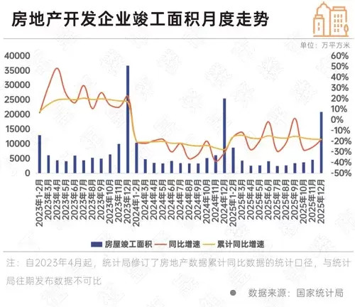 国家统计局数据显示,2025年,房屋竣工面积60348万平方米,下降18.1%。其中,住宅竣工面积42830万平方米,下降20.2%。
