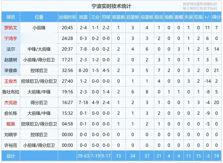 宁波队方面,全队投篮29-63,三分7-19,罚球9-17,预备74分。辛普森21分5篮板7助攻,杰克逊20分,法尔在内线送出3记盖帽砍下14分6篮板,依旧没能匡助球队拿下成功。