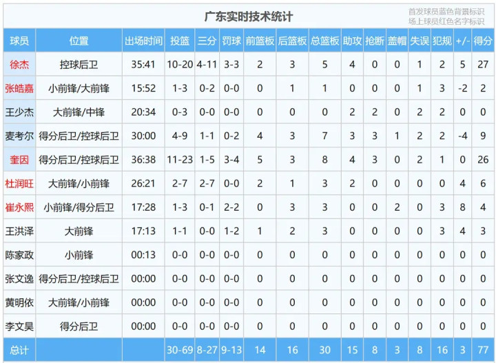 从技巧统计来看,广东队全场投篮30-69,三分球8-27,罚球9-13,预备拿下77分。徐极品为球队中枢,投篮10-20,三分4-11,罚球3-3,高效砍下27分5篮板4助攻;奎因同样孝顺26分8篮板4助攻3抢断,投篮射中率达到47.8%。