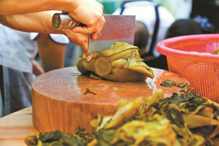 78岁的王林说自己家是溪头社区最早研制酸菜的一批人,他至今还记得,自己13岁起跟着父亲腌菜,“那时候芥菜金贵,酸菜更金贵。”腌好的酸菜,大多要拿去卖,真正留给自家吃的并不多,“酸菜是我们溪头人过年餐桌上的一道主菜,平时舍不得吃。”