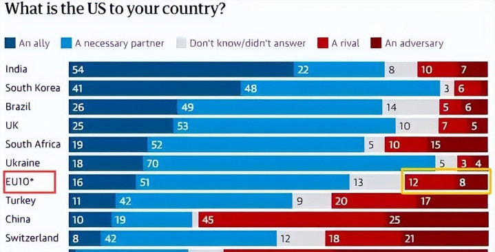 欧盟的态度转变也值得一提。2020年负面中位数60%,如今在皮尤25国报告中,欧洲负面率55%。德国法国负面高,但希腊正面多数。