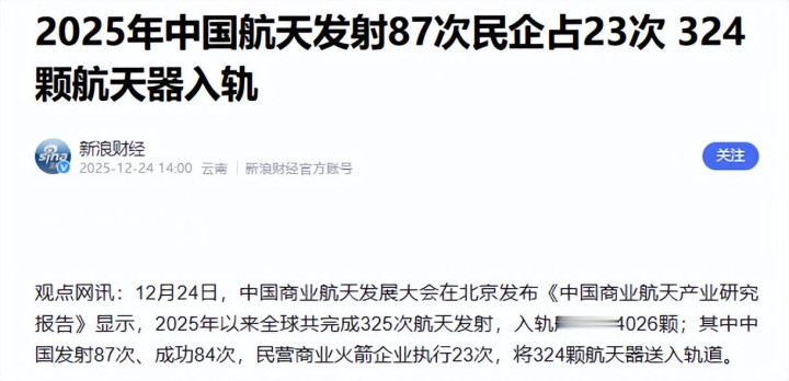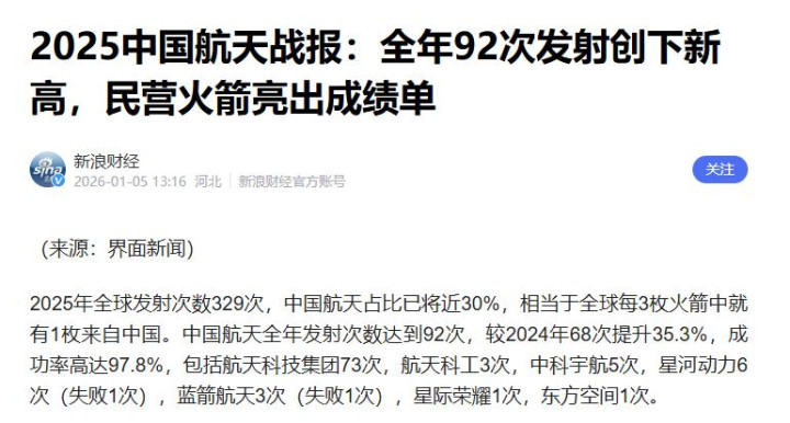 从大推力火箭发动机到复杂的卫星网络,从载人飞船到长期驻留的空间站,每一个脚印都以此为基石。根据2025年的数据,2025年全球发射次数329次,中国航天占比已将近30%,相当于全球每3枚火箭中就有1枚来自中国。中国航天全年发射次数达到92次,较2024年68次提升35.3%,成功率高达97.8%,包括航天科技集团73次,航天科工3次,中科宇航5次,星河动力6次(失败1次),蓝箭航天3次(失败1次),星际荣耀1次,东方空间1次。