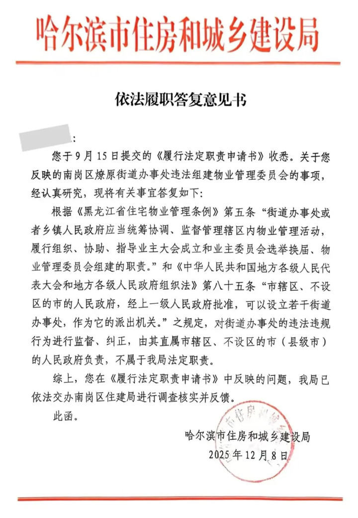 2025年12月,哈尔滨市住建局给业主的《依法履职答复意见书》引发关注。该局明确表示,对街道办组建物管会的监督“不属于我局法定职责”。